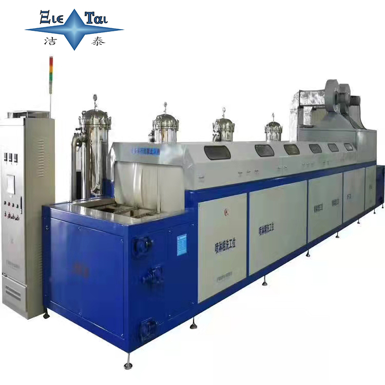 4,、采用特制網(wǎng)鏈傳動輸送工件,具有超聲波粗洗、超聲波精洗、鼓泡過水、切水、烘干、等功能的連續(xù)式清洗烘干設(shè)備。